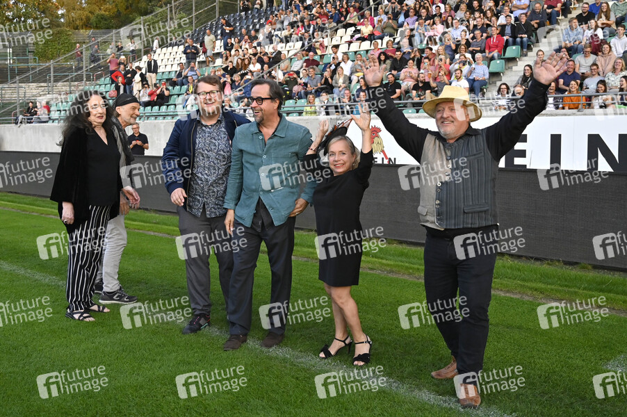 Mechthild Großmann, Claus Dieter Clausnitzer, Björn Meyer, Jan Josef Liefers, ChrisTine Urspruch und Axel Prahl bei der Premiere des ARD-Krimis 'Tatort - Ein Freund, ein guter Freund' zum 20 jährigen Jubiläum des Münsteraner Tatorts im Preußenstadion. Münster, 30.08.2022