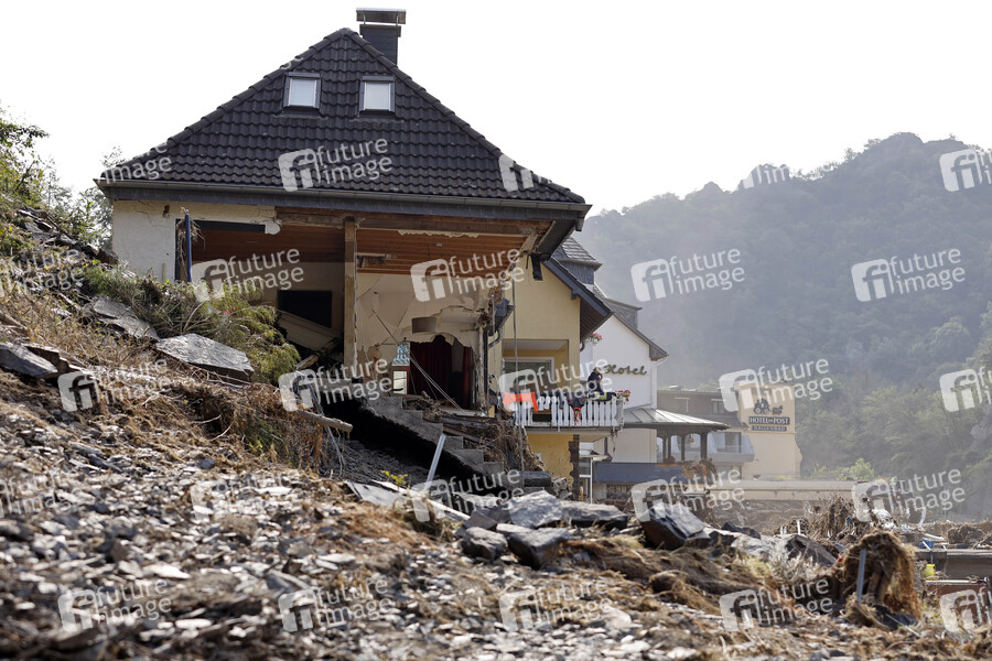 Nach dem Jahrhunderthochwasser in der Eifel durch heftige Regenfälle und Dauerregen mit Überschwemmungen und Überflutungen haben die Aufräumarbeiten im Ahrtal begonnen. Einheiten von Polizei, THW, Bundeswehr und Feuerwehr mitsamt vielen freiwilligen Helfern räumen Straßen, entfernen Schutt und Schlamm und versorgen die Menschen. Im Bild zerstörte Häuser in der Ortschaft Altenahr, in der die Flut viele Häuser zerstörte, 22.07.2021