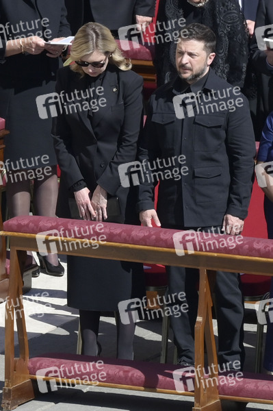 Wolodymyr Selenskyj / Volodymyr Zelenskyy mit Ehefrau Olena Selenska bei der Trauermesse für den verstorbenen Papst Franziskus auf dem Petersplatz. Vatikanstadt, 26.04.2025