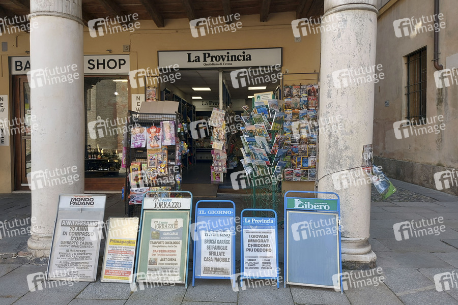 In Crema wurde der Film 'Call Me by Your Name' von Luca Guadagnino zum Großteil gedreht. Im Bild ein Zeitungskiosk aus dem Film . Crema, 31.07.2024