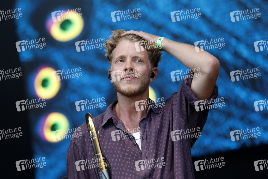 Max von Einem von der Band Bukahara live im Kulturgarten in der Bonner Rheinaue. Das Bonn Live Kulturgarten Open Air Festival 2020 ist Europas erstes Open Air Musik Festival unter Corona-Auflagen wegen der Covid-19 Pandemie. Bonn, 21.07.2020