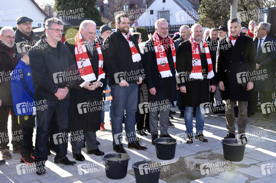 Patrick Burns, Uli Hoeneß, Mark Salzmann, Karl-Heinz Rummenigge, Christian Vorländer und Herbert Haimer bei der Grundsteinlegung für eine Gedenkvitrine zum 62. Jahrestag des Flugzeugunglücks am damaligen Flughafen München-Riem, bei dem 23 Menschen ums Leben kamen, darunter acht Fußballspieler von Manchester United, am Manchesterplatz. München, 06.02.2020