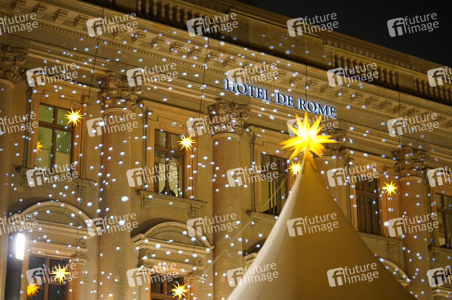 Weihnachtlich beleuchtete Fassade des Hotel der Rome - Der Weihnachtszauber am Gendarmenmarkt findet aufgrund von Bauarbeiten in den Jahren 2022-2024 am Bebelsplatz an der Staatsoper statt. Berlin, 26.11.2022