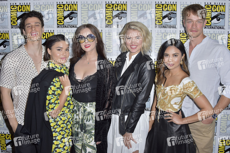 Adam DiMarco, Devery Jacobs, Katharine Isabelle, Sarah Grey, Louriza Tronco und Thomas Elms beim Photocall zur Netflix TV-Serie 'The Order' auf der San Diego Comic-Con International 2019 im Hilton Bayfront Hotel. San Diego, 18.07.2019