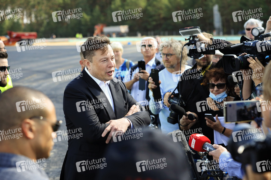 Elon Musk beim ersten Richtfest auf der Baustelle der Tesla Gigafactory Berlin-Brandenburg. Grünheide, 03.09.2020