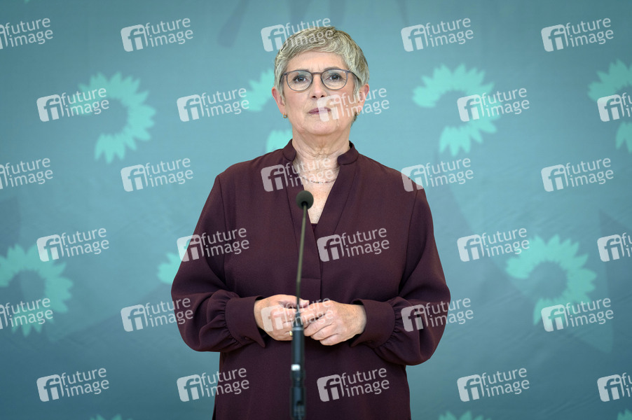 Britta Haßelmann bei einem Pressestatement zur Fraktionssitzung der Bündnis 90/Die Grünen-Bundestagsfraktion im Reichstagsgebäude. Berlin, 07.10.2025