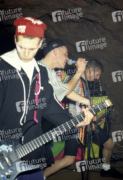 Zachary Foley, James Atkin und Ian Dench von EMF live beim Rave in the Cave. London, 08.11.1992