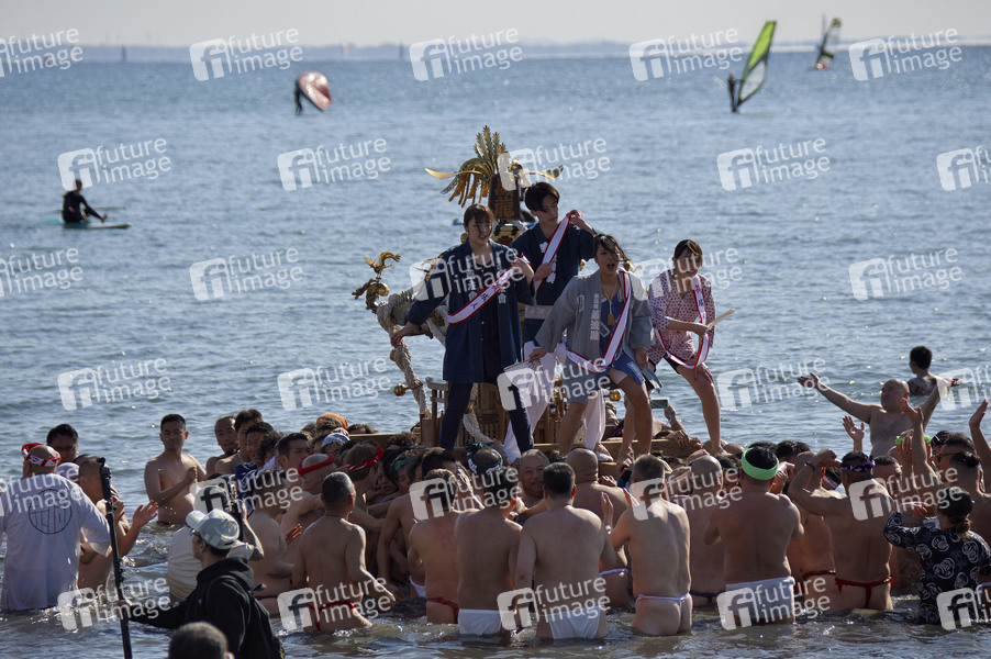 Teilnehmer auf einem tragbaren Schrein während einer Reinigungszeremonie am Strand Katase Higashihama. Fujisawa, 18.01.2026