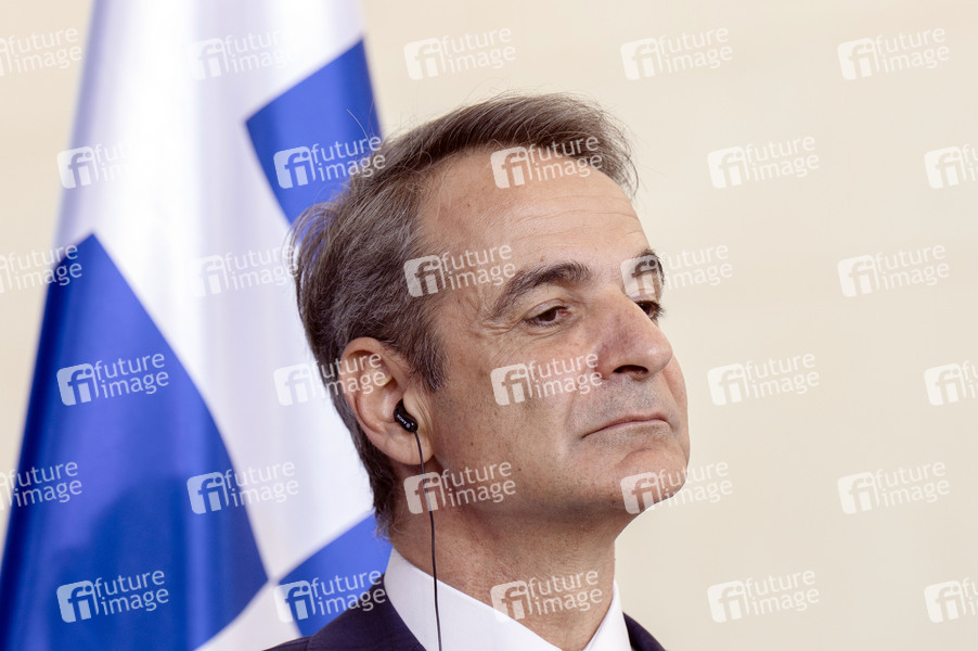 Kyriakos Mitsotakis beim Empfang des Ministerpräsidenten von Griechenland mit militärischen Ehren und zu einem gemeinsamen Gespräch mit dem Bundeskanzler mit anschließendem Pressestatement im Bundeskanzleramt. Berlin, 13.05.2025