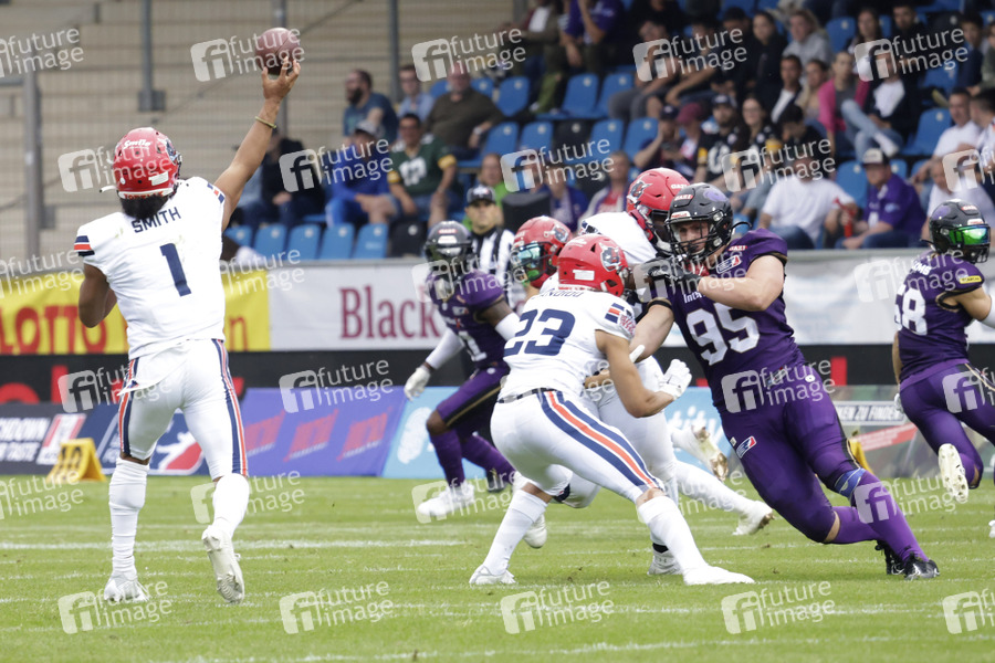 Jarvis McClam (Hamburg Sea Devils WR) beim American Football-Spiel Frankfurt Galaxy gegen Hamburg Sea Devils in der PSD Bank Arena. Frankfurt am Main, 30.06.2024