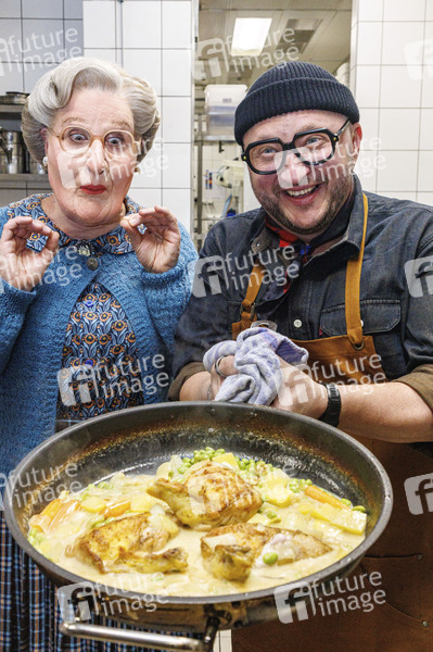 Mrs. Doubtfire / Dustin Smailes und Sebastian Lege beim Zubereiten eines cremigen One-Pan-Chicken im Paris Club Restaurant im 25hours Hotel Das Tour. Düsseldorf, 15.01.2026