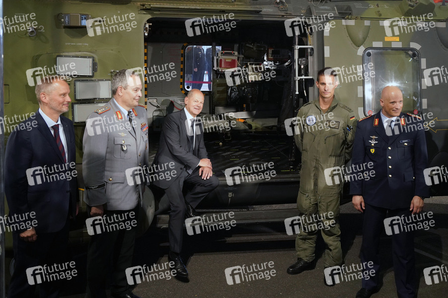Michael Schöllhorn, Alfons Mais, Olaf Scholz, Maximilian Walter und Ingo Gerhartz bei der ILA-Eröffnung mit anschließendem Rundgang auf dem ILA-Gelände am Flughafen BER Berlin-Brandenburg. Berlin, 22.06.2022