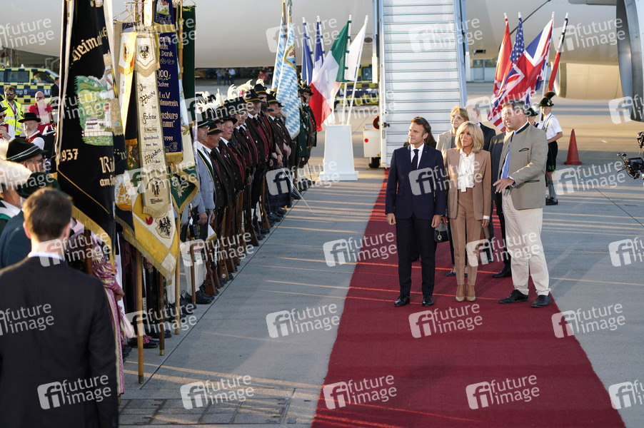 Emmanuel Macron mit Ehefrau Brigitte Macron und Markus Söder bei der Ankunft von Präsident Macron zum G7-Gipfel am Flughafen München Franz Josef Strauß. München, 25.06.2022