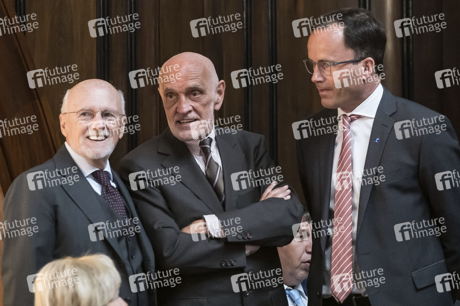 Dirk Rossmann, Martin Kind und Jochen Köckler beim Empfang zum 75. Geburtstag von Ehrenbürger und Bundeskanzler a.D. Gerhard Schröder im Neuen Rathaus. Hannover, 24.04.2019