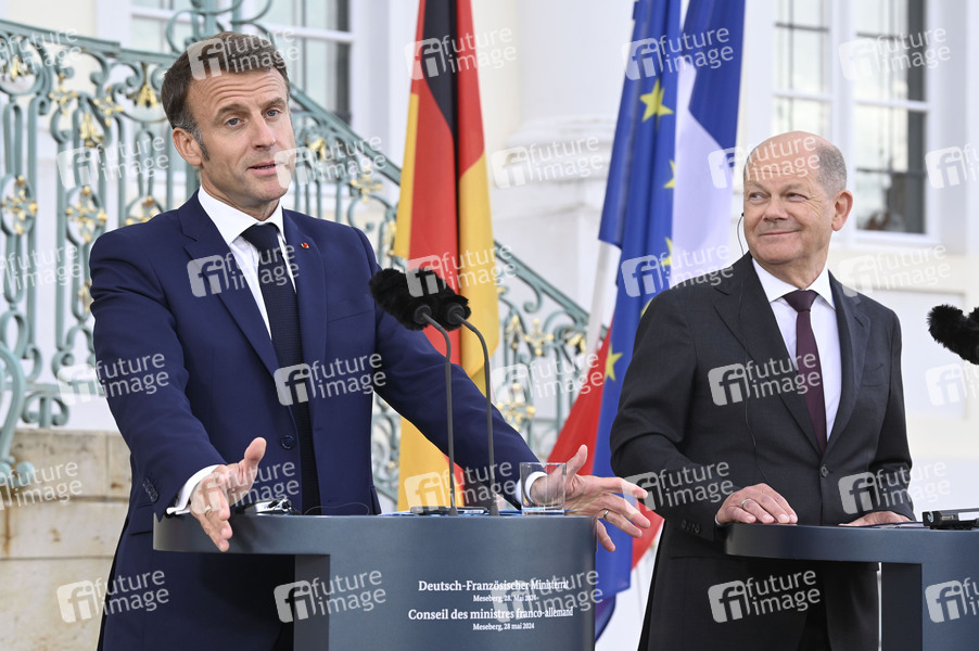 Emmanuel Macron und Olaf Scholz beim Treffen des Deutsch-Französischen Ministerrats im Gästehaus der Bundesregierung Schloss Meseberg. Meseberg, 28.05.2024