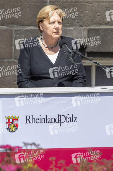 Angela Merkel bei einem Pressestatement am Rathaus nach dem Besuch der Bundeskanzlerin im Eifeldorf Schuld, das schwer von der Unterwetterkatastrophe getroffen wurde. Adenau, 18.07.2021