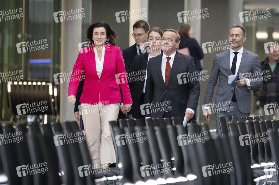 Dorothee Bär und Boris Pistorius bei der Pressekonferenz zur Weltraumsicherheitsstrategie der Bundesregierung im Paul-Löbe-Haus. Berlin, 19.11.2025