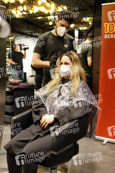 Claudia aus Großziethen gewinnt bei Arno und die Morgencrew auf 104.6 RTL den allerersten Friseur-Termin bei Shan Rahimkhan Coiffeur am Kurfürstendamm nach Wiedereröffnung der Friseursalons nach Lockerungen des Corona-Lockdowns. Berlin, 01.03.2021
