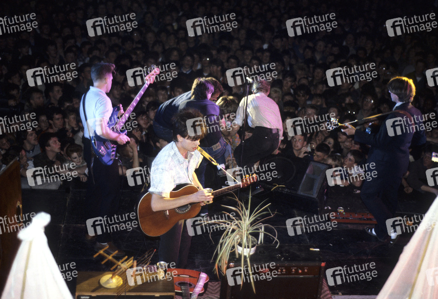 Les Pattinson, Ian McCulloch und Will Sergeant von Echo & the Bunnymen live bei einem Konzert in der St. George's Hall. Liverpool, 12.05.1984