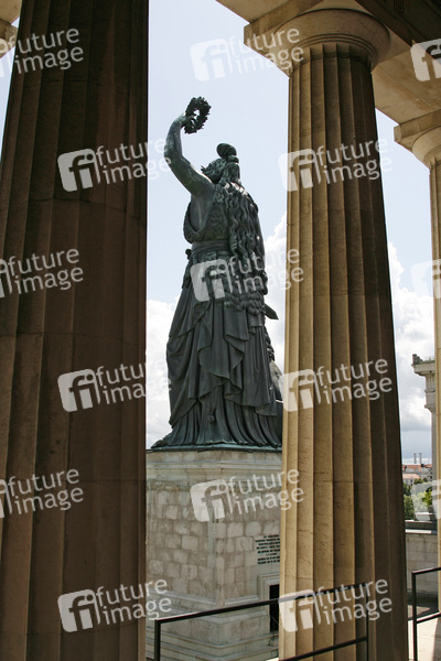 weibliche Symbolgestalt und weltliche Patronin Bayerns, im Auftrag von König Ludwig I. in den Jahren 1843-1850 errichtet, Entwürfe von Leo von Klenze, 18.52 Meter hoch, Bronzehohlguss, Höhe des Steinsockels 8.92 Meter, Bildhauer Ludwig Schwanthaler