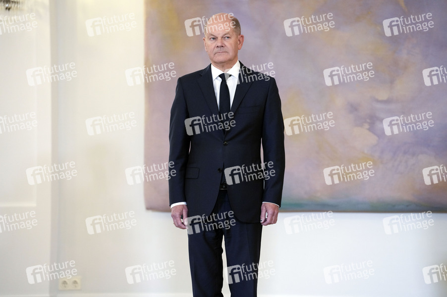 Olaf Scholz bei der Übergabe der Entlassungsurkunden gemäß Artikel 64 Abs. 1 Satz 1 des Grundgesetzes auf Vorschlag des Bundeskanzlers an den Bundesminister der Finanzen Christian Lindner, dem Bundesminister der Justiz Marco Buschmann und der Bundesministerin für Bildung und Forschung Bettina Stark-Watzinger sowie der Ernennungsurkunden für den neuen Justizminister Volker Wissing und den neuen Finanzminister Jörg Kukies im Schloss Bellevue. Berlin, 07.11.2024