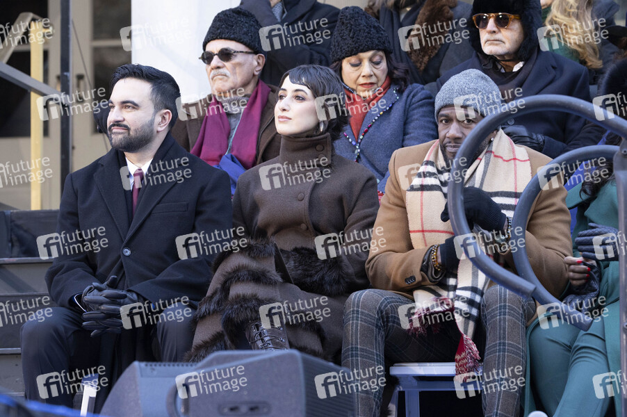 Zohran Mamdani mit Ehefrau Rama Duwaji und Jumaane Williams bei der Amtseinführung von Zohran Mamdani zum ersten muslimischen Bürgermeister von New York City in Rathaus. New York, 01.01.2026