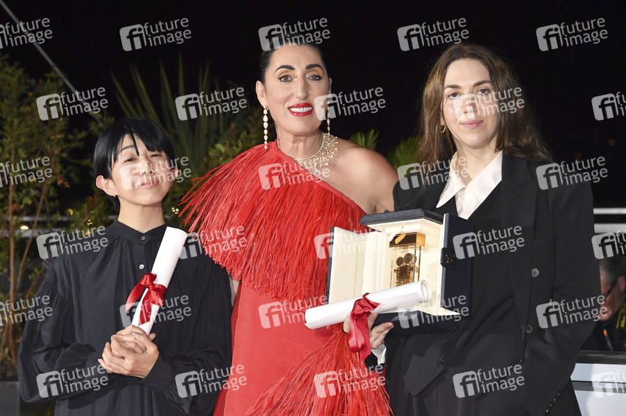Chie Hayakawa mit dem Special Mention Award für den besten Debürfilm 'Plan 75', Rossy De Palma und Gina Gammell mit der Goldenen Kamera für den besten Debütfilm 'War Pony' beim Photocall mit den Preisträgern auf dem Festival de Cannes 2022 / 75. Internationale Filmfestspiele von Cannes am Palais des Festivals. Cannes, 28.05.2022