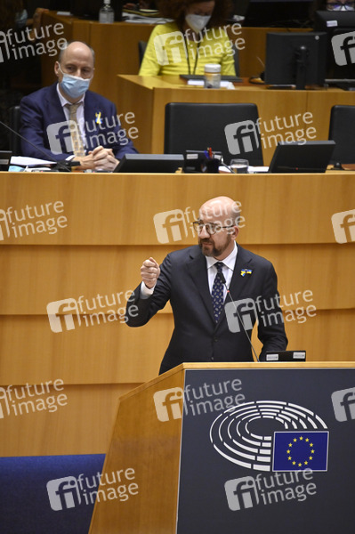 Charles Michel bei der Debatte über die Aggression Russlands gegen die Ukraine im Plenarsaal des Europäischen Parlaments. Brüssel, 01.03.2022