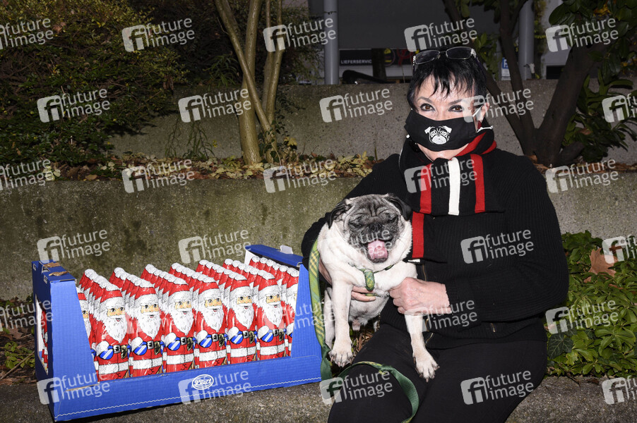Uschi Ackermann (mit Hund Willy) spendet 700 Schokoladennikoläuse an das Dr. von Haunersche Kinderspital. München, 16.12.2020