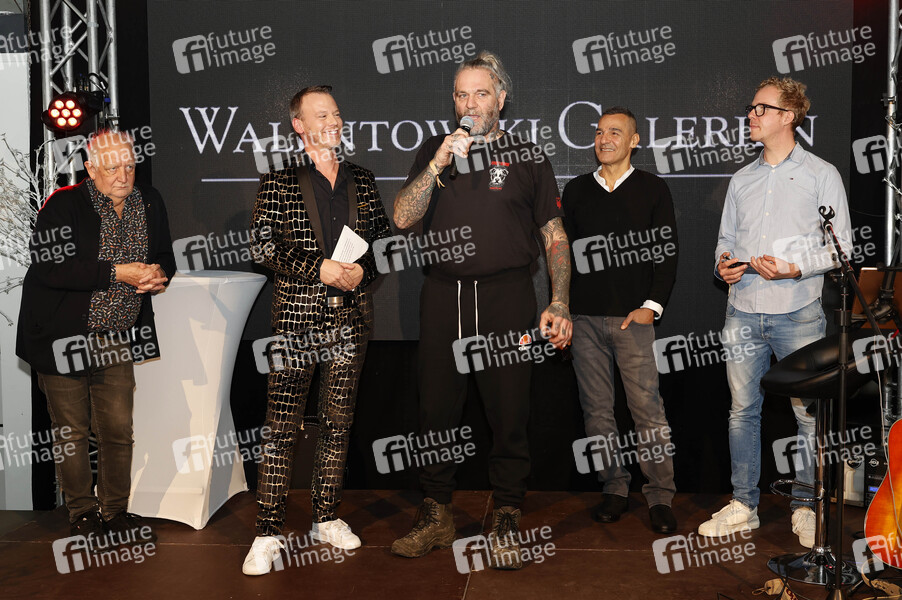 Wolfgang Leibhold, Christian Ehrlich, Ralf Seeger, Erol Sander undDaniel Danger beim Start der zweiten Kunst-Aktion 'Art'n'Schutz' zugunsten des Tier- und Artenschutzes mit einer Vernissage mit Bildern bedrohter Tiere gemalt von Promis in der Galerie Walentowski. Werl, 23.11.2024
