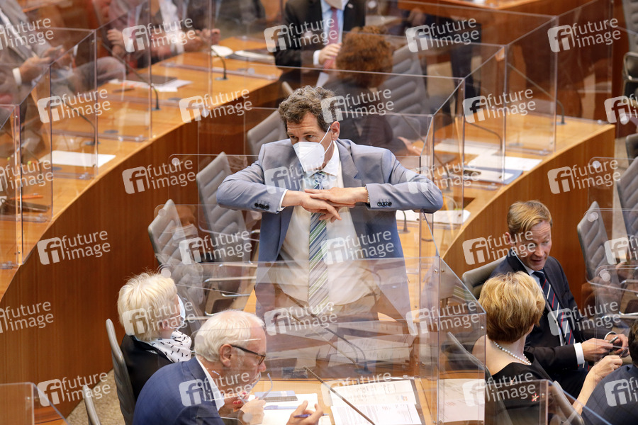 Abgeordnete getrennt durch Plexiglasscheiben bei der 125. Plenarsitzung des Landtags von NRW. Düsseldorf, 28.04.2021