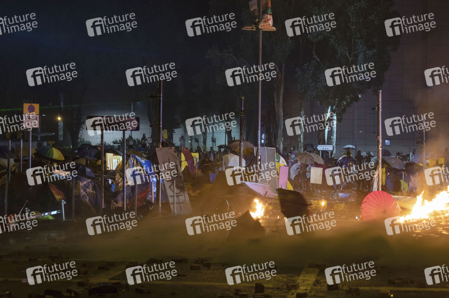 Studenten verbarrikadieren auf der Cheong Wan Road gegen den Polizeiangriff