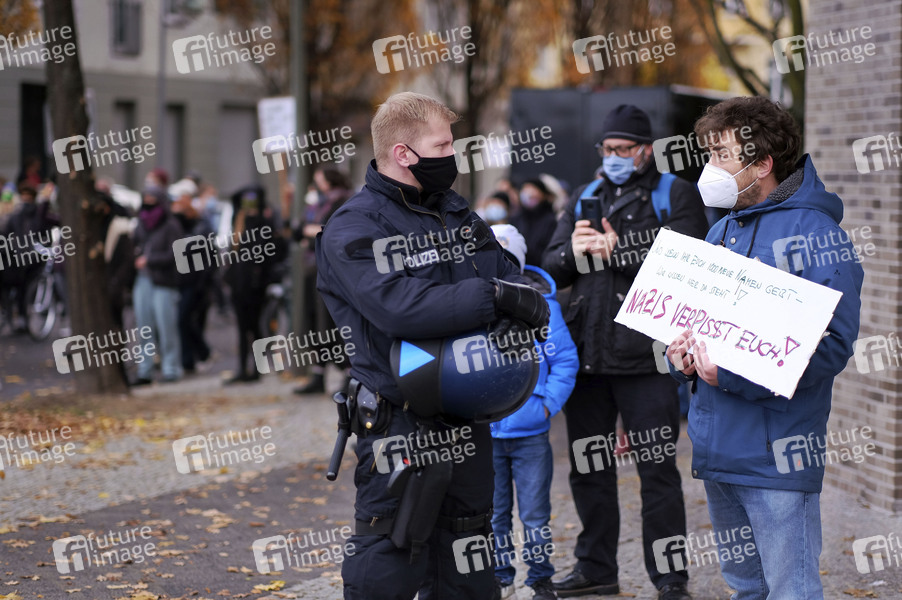 Linke Gruppen protestieren gegen eine Demonstration von Corona-Leugnern und Impfgegnern aus der Querdenken-Bewegung gegen die aktuellen Corona-Maßnahmen unter dem Motto 'Schweigemarsch gegen Diskriminierung und für Menschenrechte'. Der Demonstrationszug zieht durch den Berliner Stadtteil Prenzlauer zum Alexanderplatz. Berlin, 22.11.2020