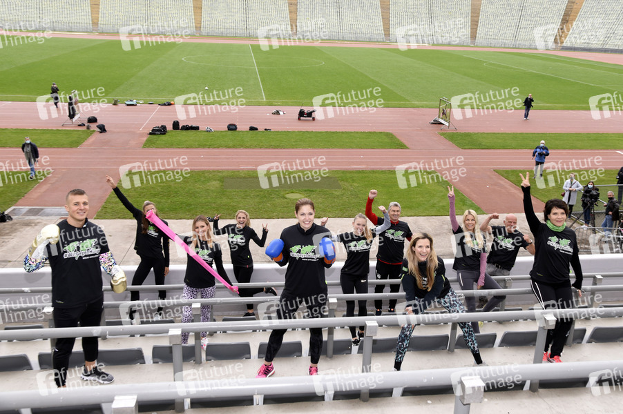 Alem Begic, Christina Hering, Karolin Kandler, Anna Kraft, Marie Lang, Katharina Trost, Klaus Augenthaler, Viola Weiss, Tina Kaiser, Stefan Lehmann und Janina Hartwig beim Fototermin zur sportichen '#WocheChallenge' im Olympiastation München. Unter dem Motto 'Wir können was bewegen!' ruft die Welthungerhilfe zu dieser Challenge auf und bittet um Spenden für eine Welt ohne Hunger. München, 13.10.2020