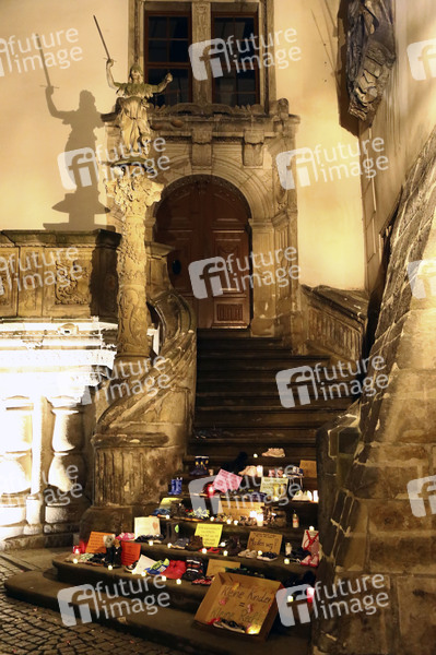 Aus Protest gegen erneute Schulschließungen haben Eltern Kinderschuhe, Plakate und Banner vor dem Rathaus Görlitz abgelegt. Görlitz, .22.03.2021