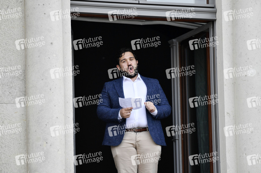 Andres Moreno Garcia bei der Hotel de Rome Wiedereröffnung mit Mitgliedern des Internationalen Opernstudios der Staatsoper Unter den Linden, welche aus den Fenstern des Hotels mit Renato Rascels 'Arrivederci, Roma' und Paul Linckes 'Berliner Luft' den Bebelplatz zum Klingen bringen. Berlin, 17.06.2020