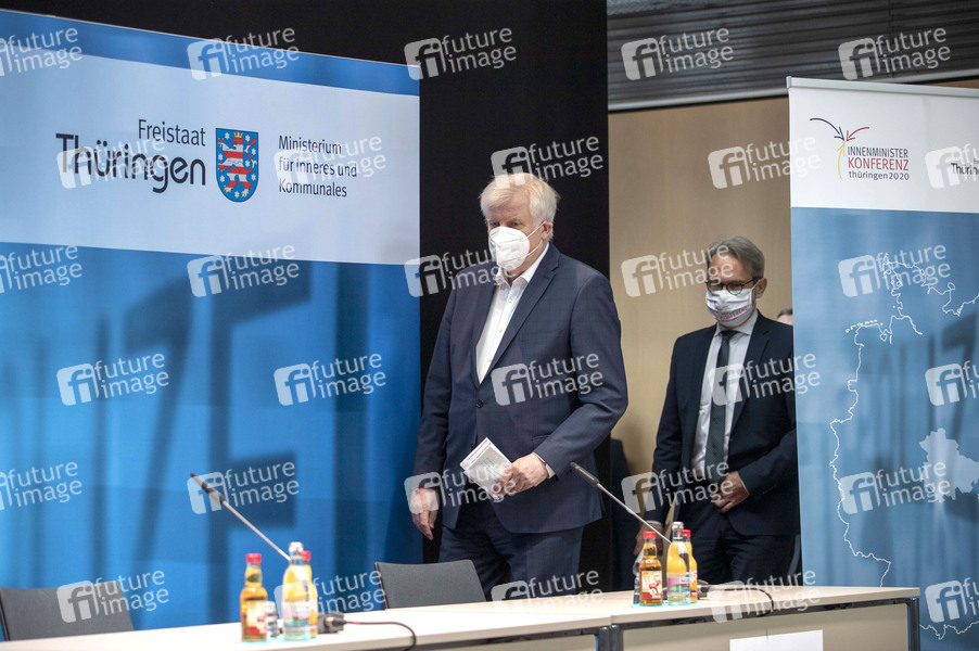 Politiker, CSU, Bundesminister des Innern, SPD, Innenminister von Thüringen, Politik, IMK, Ständige Konferenz der Innenminister und der Länder, interföderales Abstimmungsgremium, Treffen, Versammlung, PK, Corona, Coronamaßnahmen, Corona-Schutzmaßnahmen, Atemschutz, Atemschutzmaske, Virenschutz, Schutzmaske, Maske, Mundschutz, Mund-Schutz, Mundschutzpflicht, Maskenpflicht, Mundschutz-Pflicht, Mund-Nase-Schutz, Mund-Nasen-Schutz, MNS