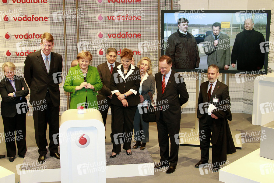 Eröffnungsrundgang von Bundeskanzlerin Merkel auf der CeBIT 2012 (Centrum der Büro- und Informationstechnik), der weltgrößten Messe für Informations- und Computertechnik auf dem Messegelände, Hannover - Am Messestand von Vodafone