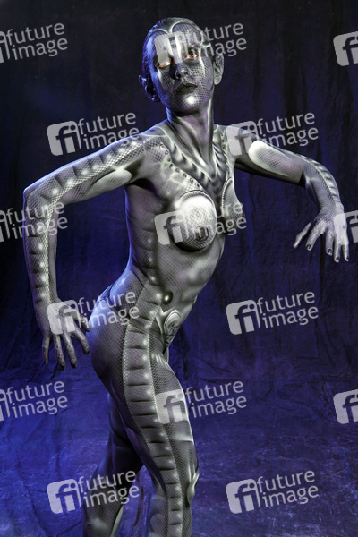 Bodypainting, Erotik, Frau, nackt, drinnen, weiblich, Monster, Außerirdische, Alien, Echse, Körperkunst, Kunst, Malerei, monochrom, erotic, woman, nude, indoor, female, monochrome, lizard, body art, body painting