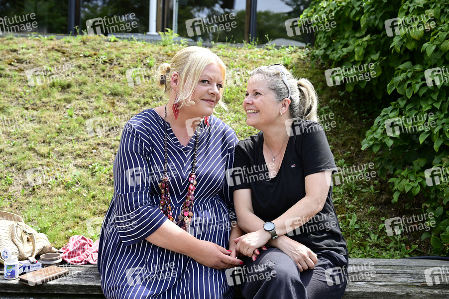 Tine Wittler und Michaela Schaffrath bei der Fotoprobe zum Theaterstück 'Jedermann' am Pavillon im Weimarhallenpark. Weimar, 10.07.2024