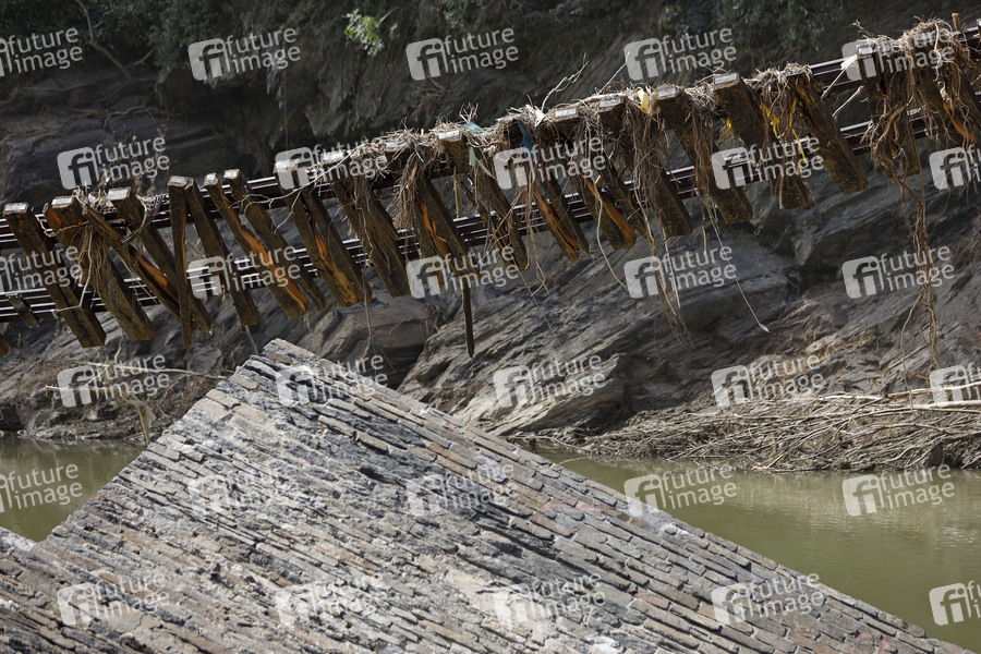 Nach dem Jahrhunderthochwasser in der Eifel durch heftige Regenfälle und Dauerregen mit Überschwemmungen und Überflutungen haben die Aufräumarbeiten im Ahrtal große Fortschritte gemacht. Einheiten von Polizei, THW, Bundeswehr und Feuerwehr mitsamt vielen freiwilligen Helfern haben Straßen geräumt, Schutt und Schlamm entfernt und die Menschen versorgt. Der Wiederaufbau wird trotzdem Jahre dauern. Im Bild Flutschäden an einer Eisenbahnbrücke nahe der Ortschaft Rech, in der die Flut viele Häuser zerstörte, 30.07.2021
