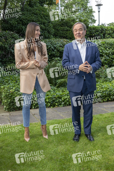Sophia Thomalla und Armin Laschet beim Fototermin zum Online-Talk auf Facebook vor der Landesgeschäftsstelle der CDU Nordrhein-Westfalen. Düsseldorf, 25.06.2021
