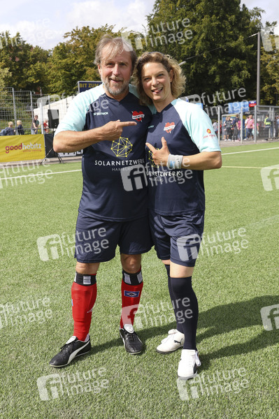 Bjarne Mädel und Anjorka Strechel beim Benefiz-Fußballspiel 'Kicken mit Herz' 2023 zu Gunsten des Herzzentrums des UKE im Stadiun Hoheluft. Hamburg, 03.09.2023