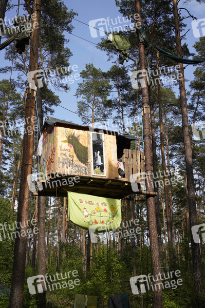 Mit einem Camp im Wald bei Tesla in Grünheide protestieren Baumbesetzer seit Ende Februar gegen die Erweiterung der Gigafactory. Im Protestcamp leben derzeit etwa 20 bis 100 Menschen. Sie schlafen auf rund 15 Konstruktionen in den Bäumen verteilt oder in Zelten am Boden. Grünheide, 04.05.2024