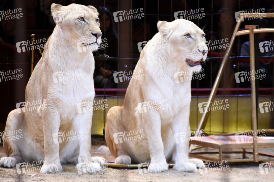 Weiße Löwinnen beim 3. Presseempfang mit kommentierten Raubtiertraining anlässlich des neuen März-Programms vom Circus Krone im Circus Krone Bau. München, 23.02.2020
