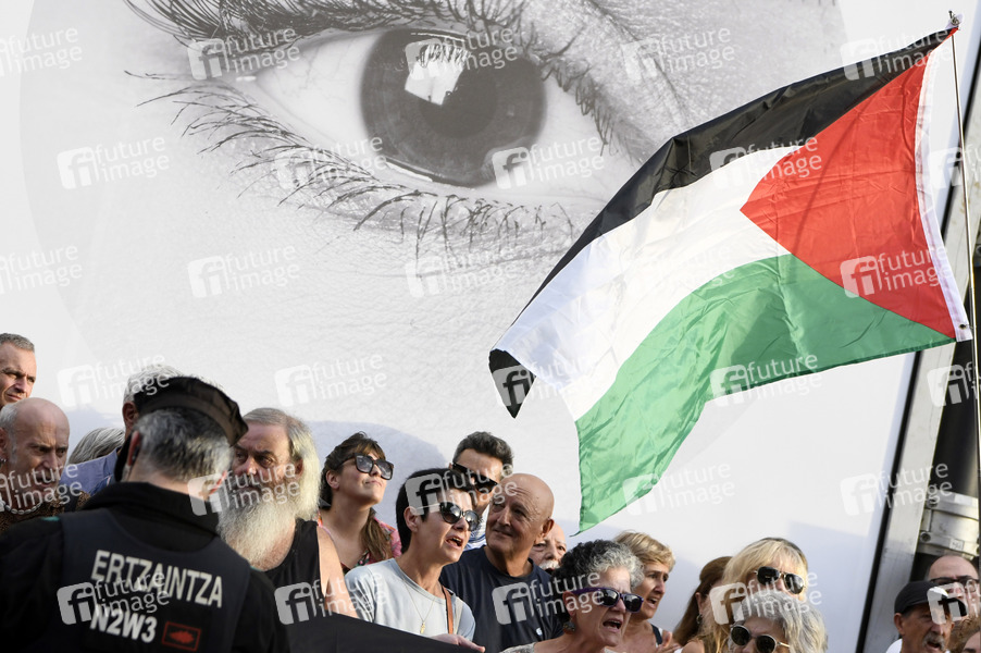 Anti-Israel-Demo, Demonstration, Protest, Filmpremiere, Premiere, Kino, Film, Eröffnung, Opening Ceremony, Eröffnungsgala, Roter Teppich, Ankunft, Unterhaltung, Entertainment, Kultur, Filmfest, Internationales Filmfestival, SSIFF, 73rd San Sebastian International Film Festival, Donostia Zinemaldia - Festival de San Sebastián