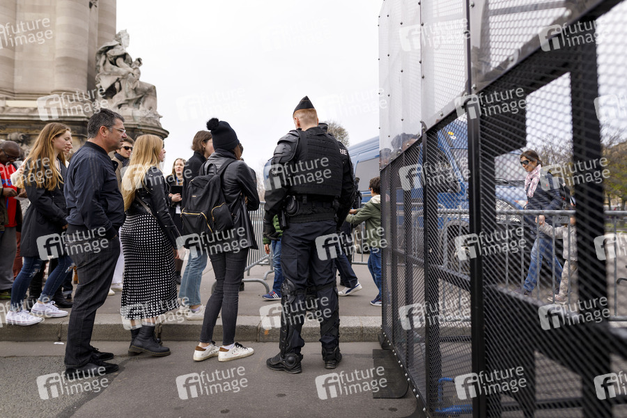 Sicherheitskräfte der französischen Gendarmerie bewachen wichtige Straßen und errichten Checkpoints rund um den Champ Elysees. Paris, 23.03.2019