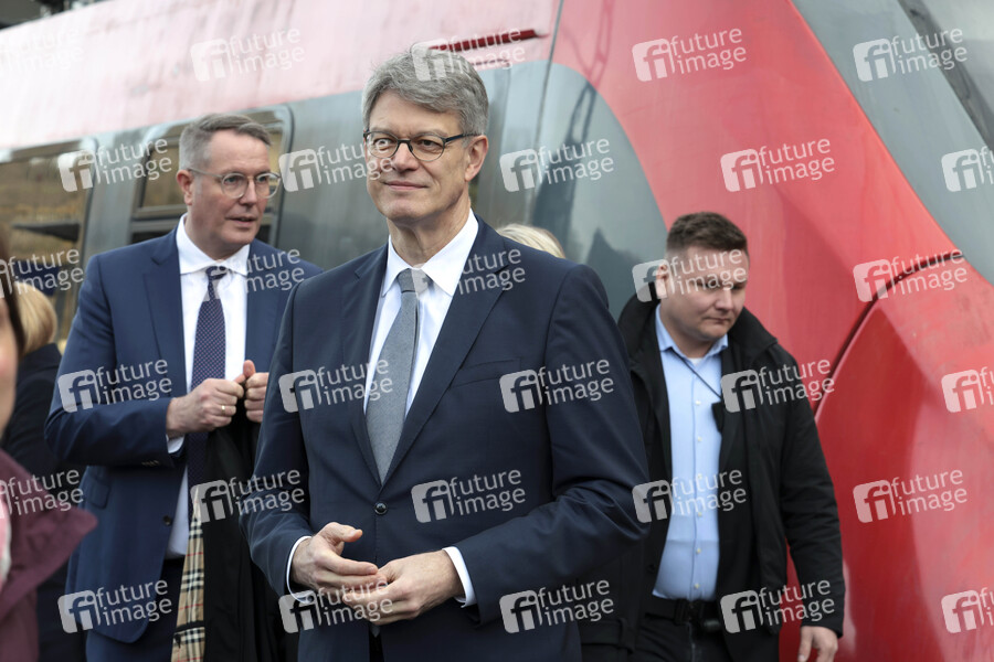 Alexander Schweitzer und Patrick Schnieder bei der Inbetriebnahme der neuen Ahrtalbahn mit Sonderfahrt von Dernau nach Altenahr. Altenahr, 12.12.2025