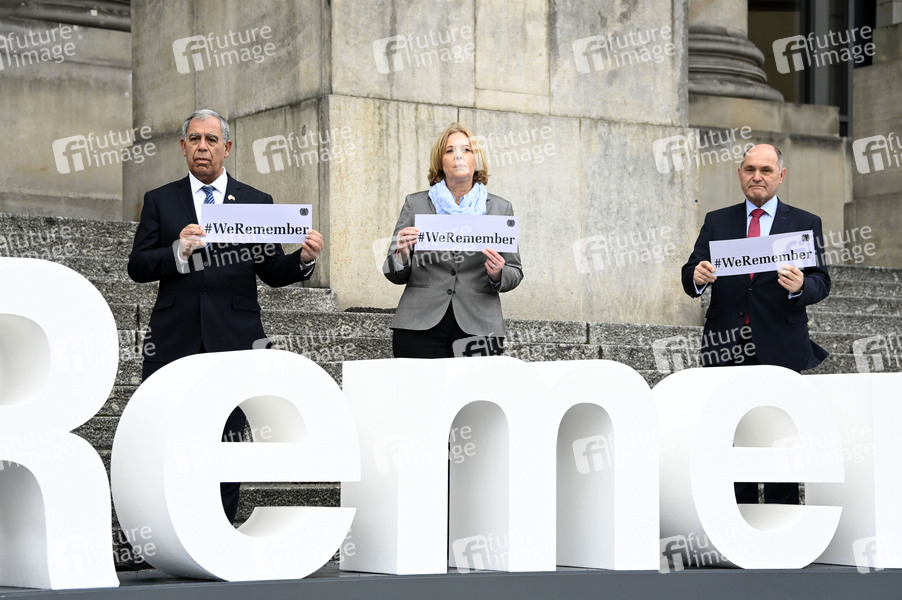 Mickey Levy, Bärbel Bas und Wolfgang Sobotka bei den Pressestatements von Wolfgang Sobotka, Mickey Levy und Bärbel Bas am Schriftzug #WeRemember zur Erinnerung an die Millionen im Nationalsozialismus ermordeten Juden vor dem Reichstagsgebäude. Berlin, 25.01.2022