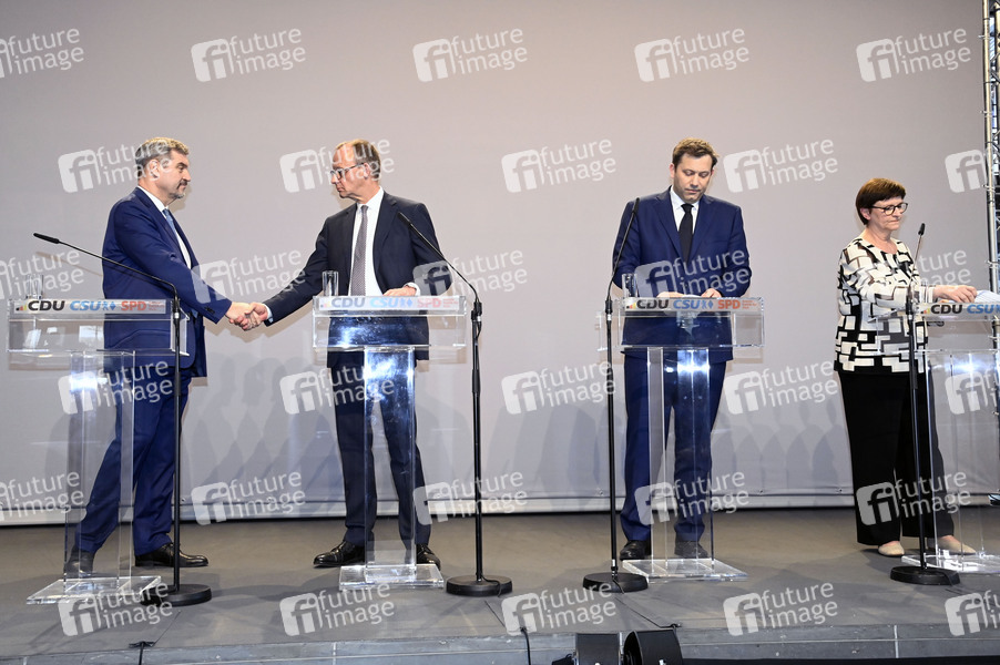 Markus Söder, Friedrich Merz, Lars Klingbeil und Saskia Esken bei der Pressekonferenz von CDU, CSU und SPD zur Vorstellung des gemeinsamen Koalitionsvertrages im Paul-Löbe-Haus. Berlin, 09.04.2025